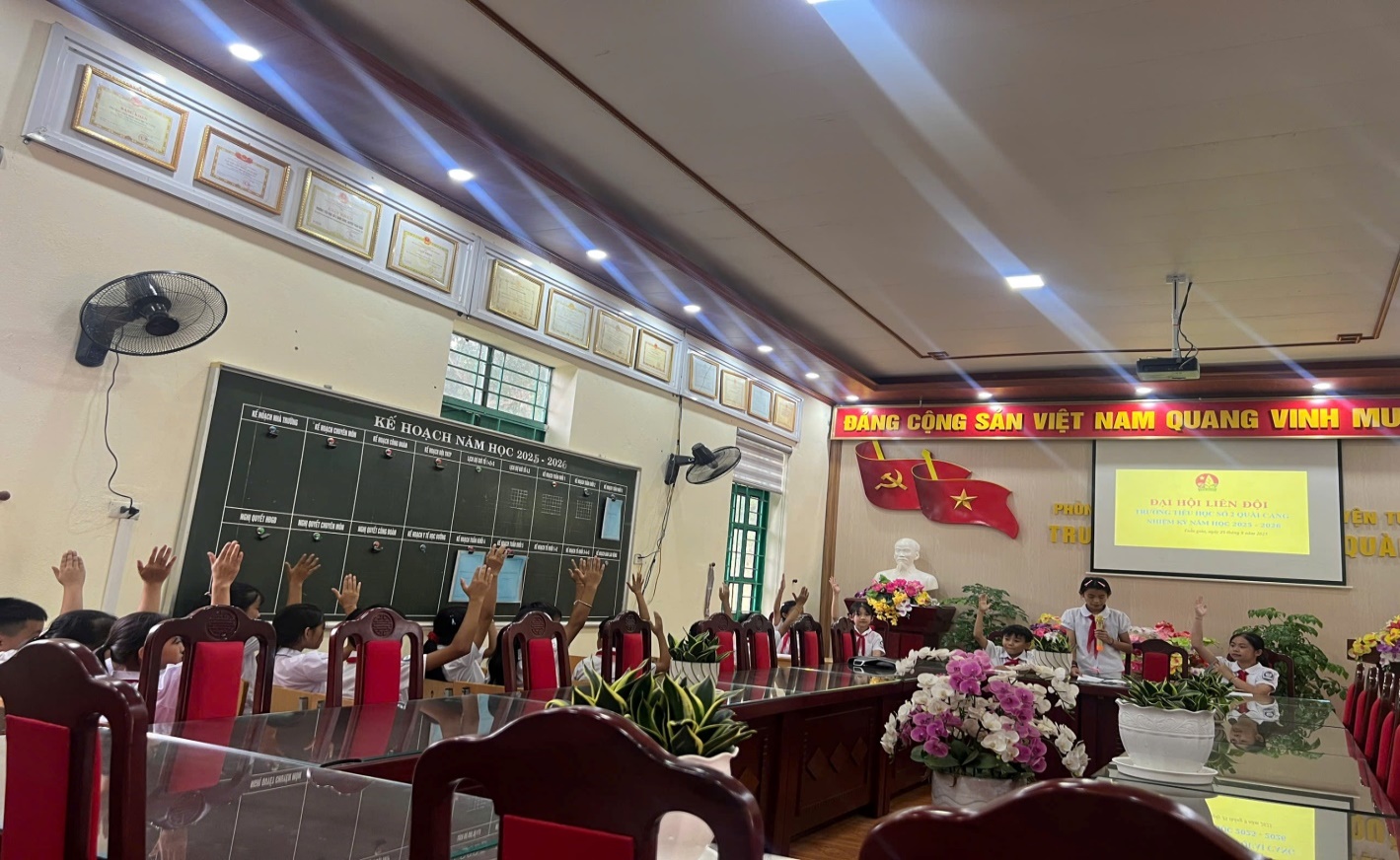 BÀI VIẾT TRUYỀN THÔNG ĐẠI HỘI LIÊN ĐỘI NĂM HỌC: 2025-2026 Căn cứ kế hoạch số: 113-CTr/HĐĐ ngày 24 tháng 8 năm 2025 của Hội đồng đội tỉnh Điện Biên Căn cứ vào kế hoạch hoạt động tháng 9 của trường tiểu học số 2 Quài Cang. Căn cứ vào Kế hoạch Chương trình công tác Đội và phong trào thiếu nhi năm học 2025 - 2026 của Liên đội trường tiểu học số 2 Quài Cang; Được sự chỉ đạo của chi bộ Đảng, ban giám hiệu nhà trường. Ngày 25 tháng 9 Liên đội trường Tiểu học số 2 Quài Cang long trọng tổ chức Đại hội liên đội nhằm kiện toàn tổ chức Ban chỉ huy liên đội năm học 2025-2026. Về dự với Đại hội có cô giáo: Trịnh Thị Việt - Bí thư chi bộ - Hiệu trưởng nhà trường Thầy giáo Chu Văn Thọ - Phó bí thư - Phó hiệu trưởng nhà trường Cùng toàn thể các anh chị phụ trách của các chi đội và sao nhi đồng và 43 đại biểu tiêu biểu đại diện cho 13 chi đội và sao nhi đồng cùng về dự Đại hội Chào cờ tuyên bố lý do giới thiệu Đại biểu Các anh chị phụ trách tham dự Đại hội liên đội